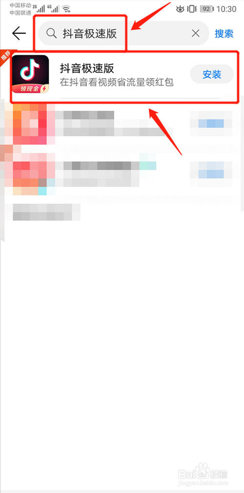 点击搜刮框,输入”抖音极速版“,下面会呈现抖音极速版应用图标,点击”抖音极速版应用图标“,进入抖音极速版本家儿页。
