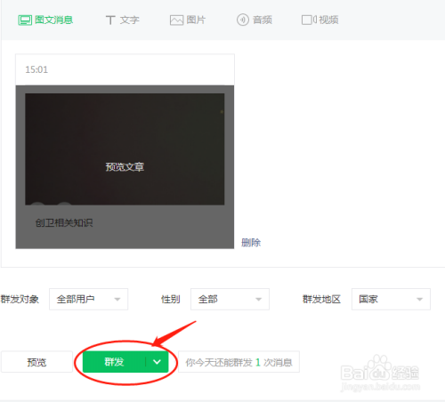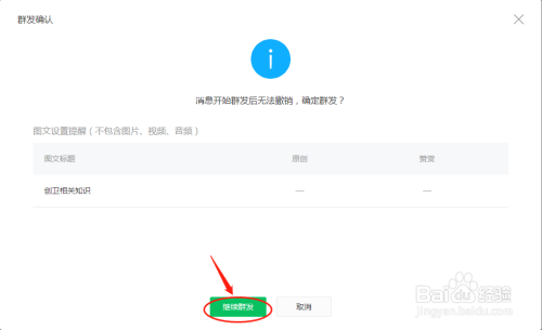 接着,在弹出的页面中再次点击【群发】和【继续群发】并利用办理员微信扫描二维码验证后颁发文章撤退退却出公家号;