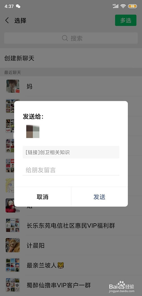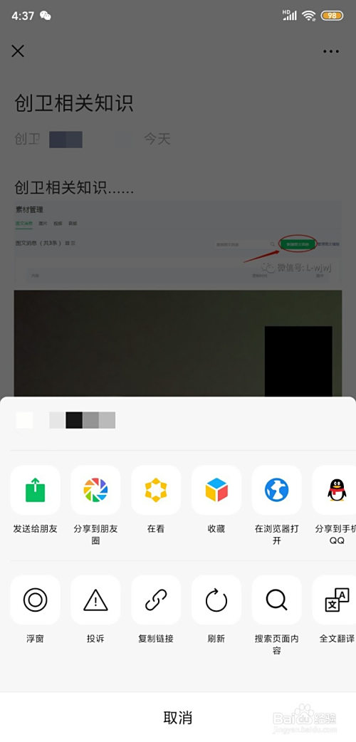 退出公家号后,用办理员微信将“创卫相关常识”的文章分享到伴侣圈、分享给其他伴侣,即可宣传创卫相关常识。如下图所示: