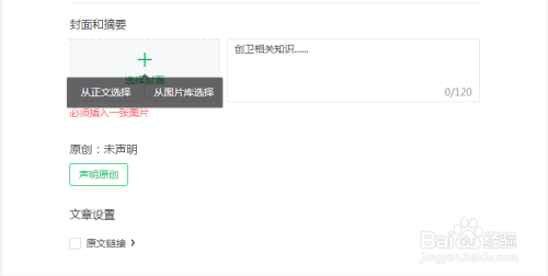 4.在弹出的页面中以写文章的形式将想要传布的“创卫相关常识”填写,并插入相关图片,