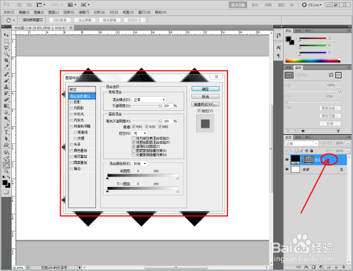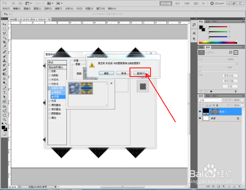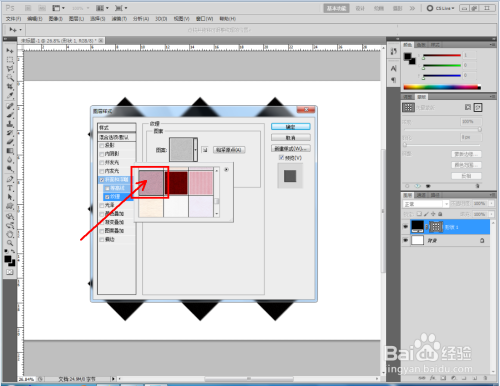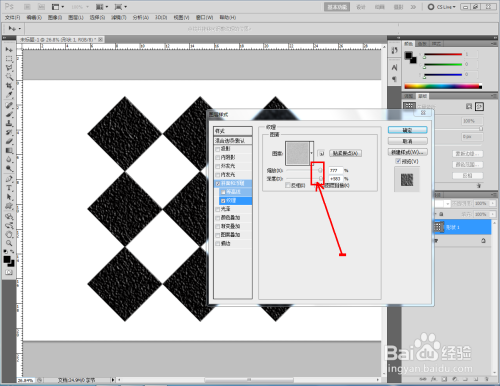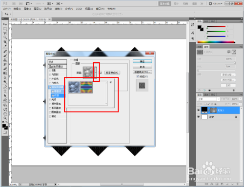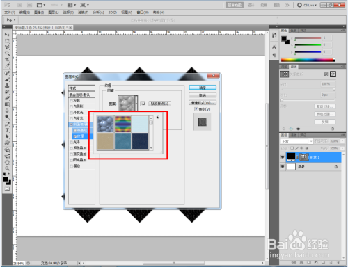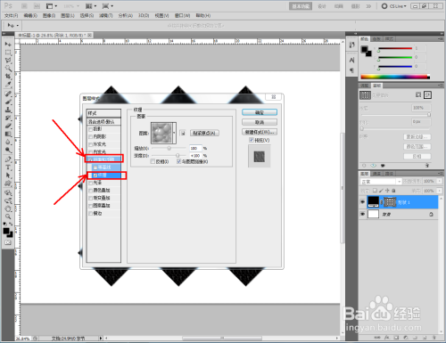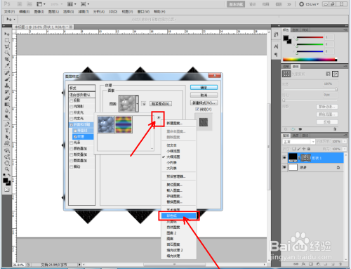 双击图示自界说图案图层,弹出图层样式设置栏。勾选【斜面和浮雕】-【纹理】,点击图示小三角,弹出图案选项栏;