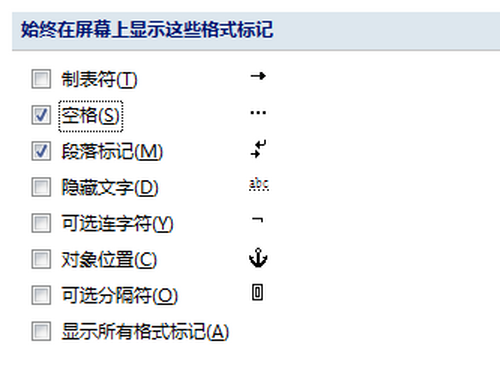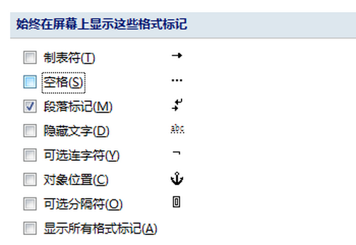 点击“显示”之后,在“始终在屏幕上显示这些格局标识表记标帜”中就会看到有一条空格标识表记标帜的内容,我们将其前方的方框内打钩,即点击一下即可。