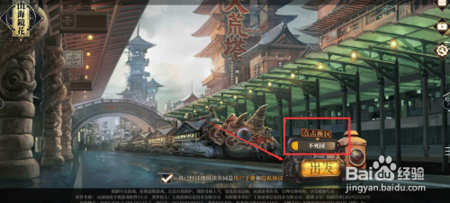 第一:手机安装【山海镜花】客户端打开游戏选择【大区】点击【出发】按钮。