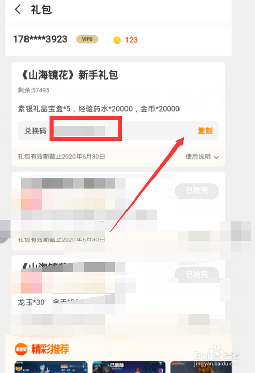 第四:点击【山海镜花新手礼包】领取然后复制【兑换码】。