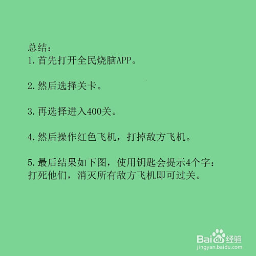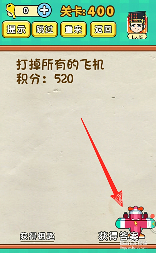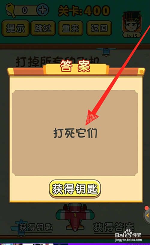 5.最后成果如下图,利用钥匙会提醒4个字:打死他们,覆灭所有敌方飞机即可过关。