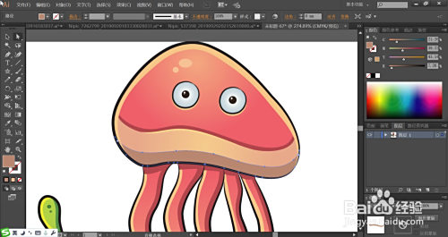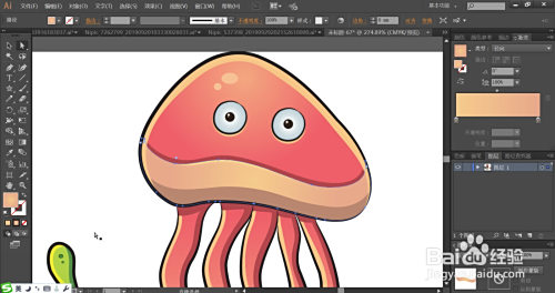 利用天蓝色的渐变与黑色搭配填充眼晴地点的圆形路径,头部的高光圆点利用浅粉色填充。八爪鱼的腿利用不异的填色方式,左侧为亮光区域,右侧为暗光区域。