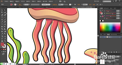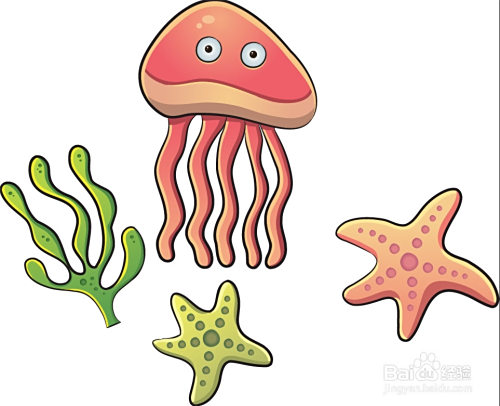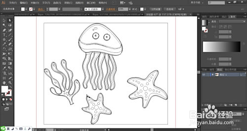 利用钢笔画出八爪鱼的根基身体轮廓,再用圆形画出它们的眼晴,最后绘制身世体左侧与右侧的光线明暗路径,绘制出左侧海洋植物的细节路径,八爪鱼与海星身体概况的图案细节路径。