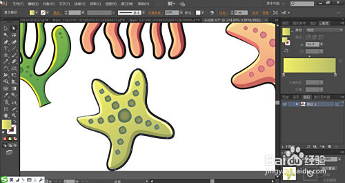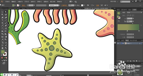 最后,我们利用黄绿色的渐变填充小海星的本家儿体,再利用暗绿色的渐变填充小海星身上的圆点图案,利用浅绿色填充小海星边缘的亮光,利用暗绿色填充小海星下边缘的暗光路径,完当作八爪鱼海星图片设计。