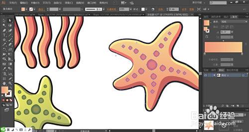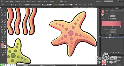 利用粉红色的渐变填充海星身上的圆点图案,利用黄色填充亮光边缘,利用暗粉色填充暗光边缘。