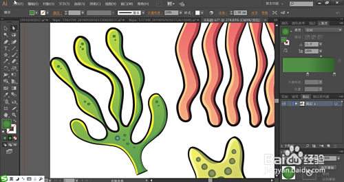 植物上面的圆点图案利用暗绿色的径标的目的渐变填充,右侧的粉红色海星利用浅粉红色的渐变填充本家儿体。