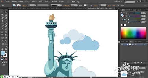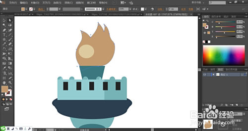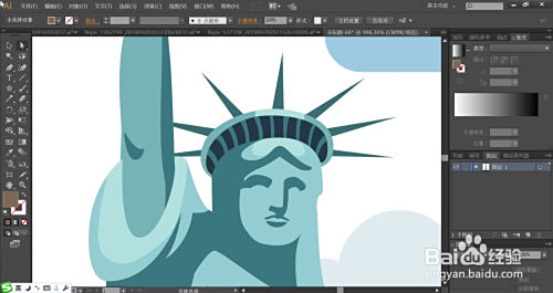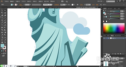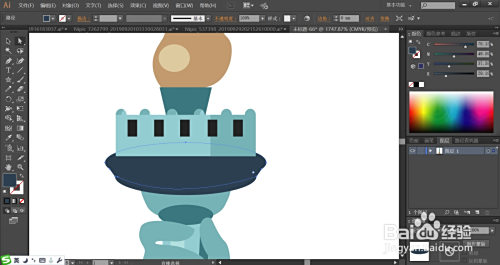 雕像的脸部利用明暗青色搭配填充,脸部左侧的暗光与面部的脸色元素路径利用暗青色填充,雕像的帽子利用暗青色、青色、蓝黑色搭配填充细节布局。