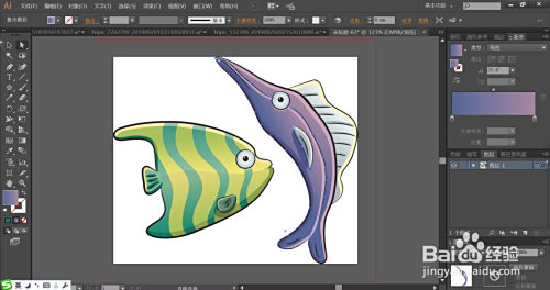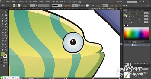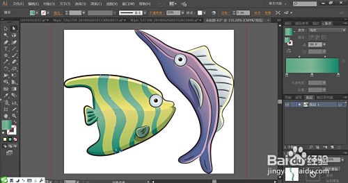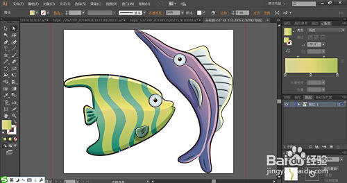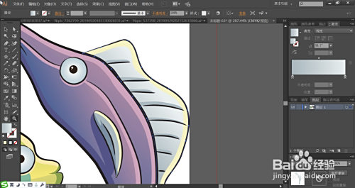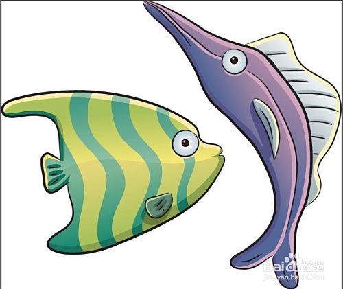 利用天蓝色的渐变填充尖嘴鱼的鱼鳍,再用黄灰色填充鱼鳍的高光路径,尖嘴鱼的眼晴与小鱼鳍的填色方式不异,完当作不雅赏鱼图片设计。