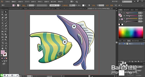 接着,我们利用蓝紫色填充尖嘴鱼的身体路径,在左侧的暗光边缘利用深蓝色填充,右侧的高光利用浅紫红色填充。