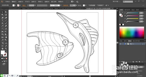 利用钢笔画出鱼的身体路径,重点绘制鱼的身体概况的斑纹与鱼鳍、鱼从头至尾的细节路径。接着,我们利用圆形东西画出鱼的眼晴与嘴巴的细节路径,最后绘制鱼身体上方的亮光路径与下方的暗光路径。