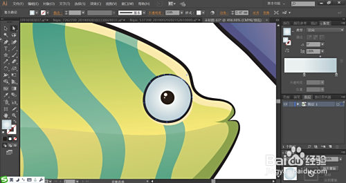 利用天蓝色的渐变填充鱼眼晴的眼白路径,再用黑色填充眼晴的瞳孔与外边缘路径。