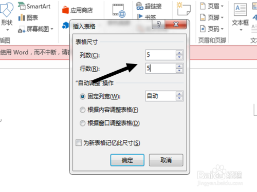 也可以选择插入表格,然后填上本身需要的几行几列的数字,好比5*5的表格,点击确定即可。