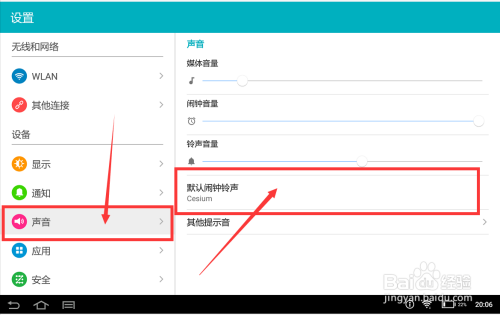 在声音设置中找到“默认闹钟铃声”,点击打开。