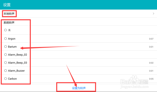 若是不喜好系统自带,可以选择“当地铃声”,若是平板有下载的音乐,选中之后设置为铃声即可,撑持歌曲搜刮。