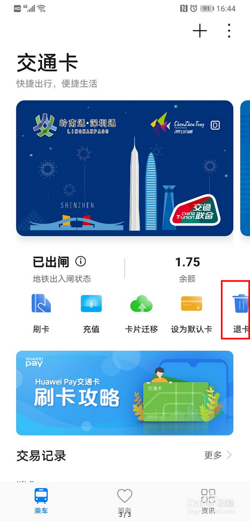 进入 钱包 > 交通出行 ,点击 交通卡卡面下方的退卡,按照提醒操作。