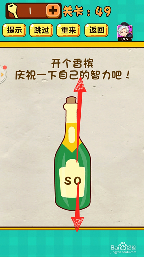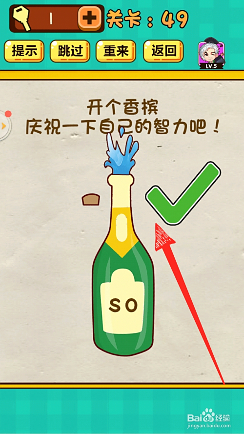 5.最后成果如下图,喷鼻槟喷出打开酒瓶,呈现绿色对勾,即可过关。