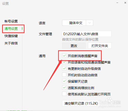 选择通用设置页面,在通用处,勾选“开启新动静提醒声音”。