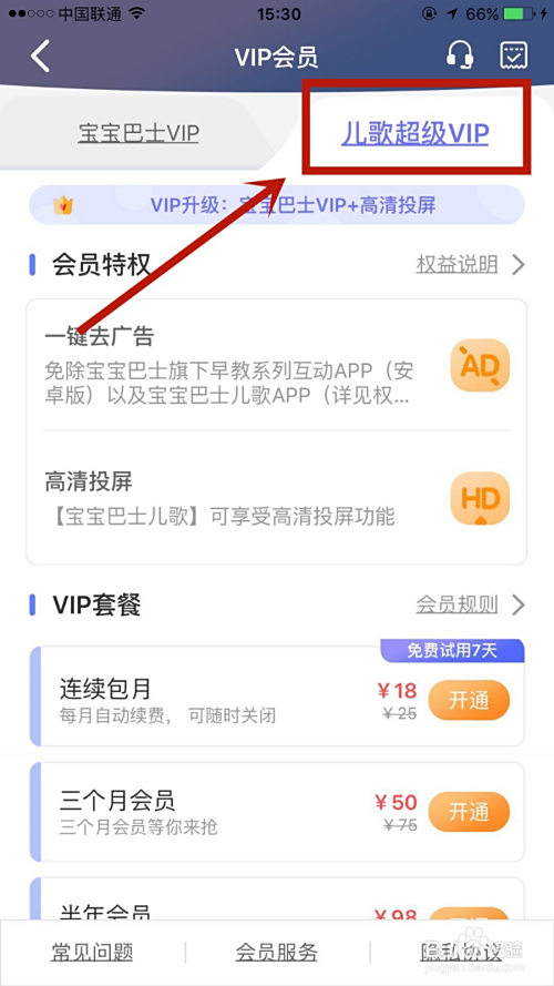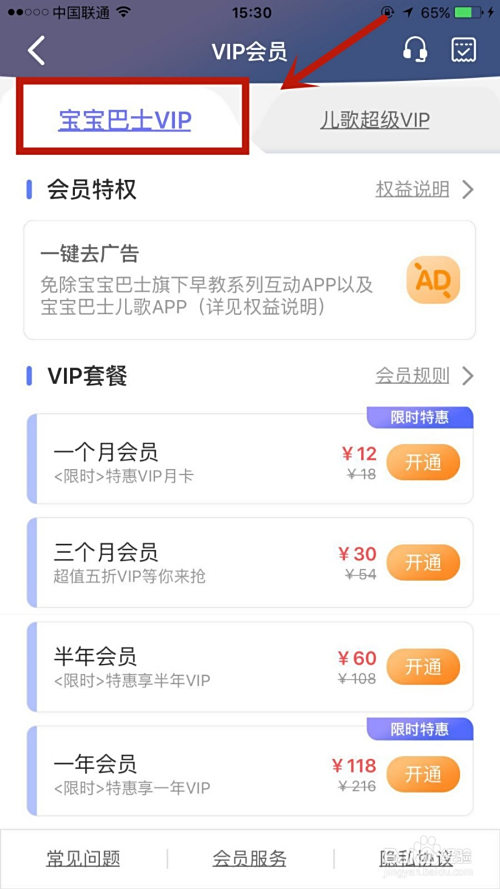 或者点击儿歌超等VIP,找到合适的会员时候进行开通即可。