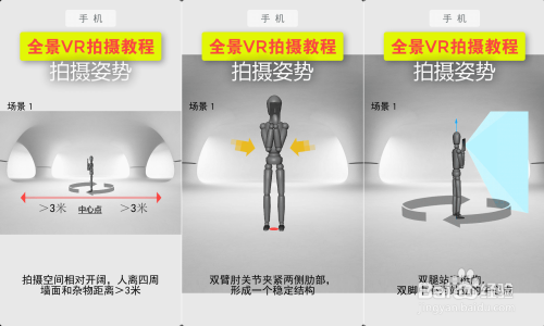 与在大场景姿势分歧,此时为尽可能避免视差偏移现象,拍摄扭转时中间轴不克不及再以人体为中间,而应一只脚微微前伸,以手机与前伸之脚尖为中间轴扭转一圈拍摄。