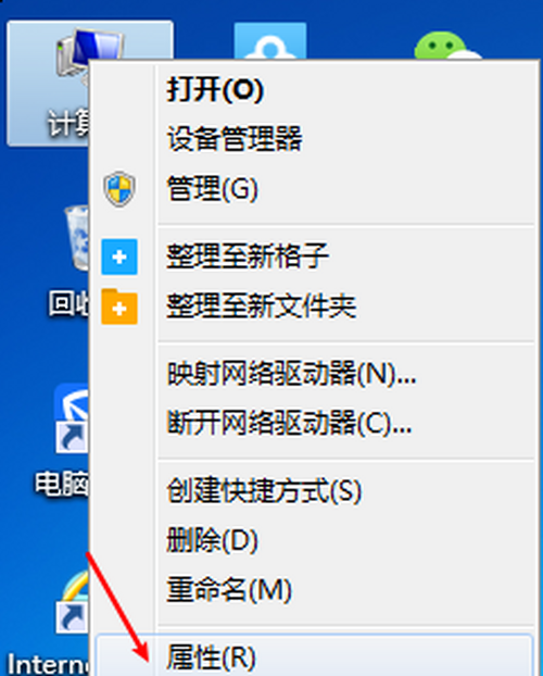 桌面找到计较机,右键单击,选择属性,如下图