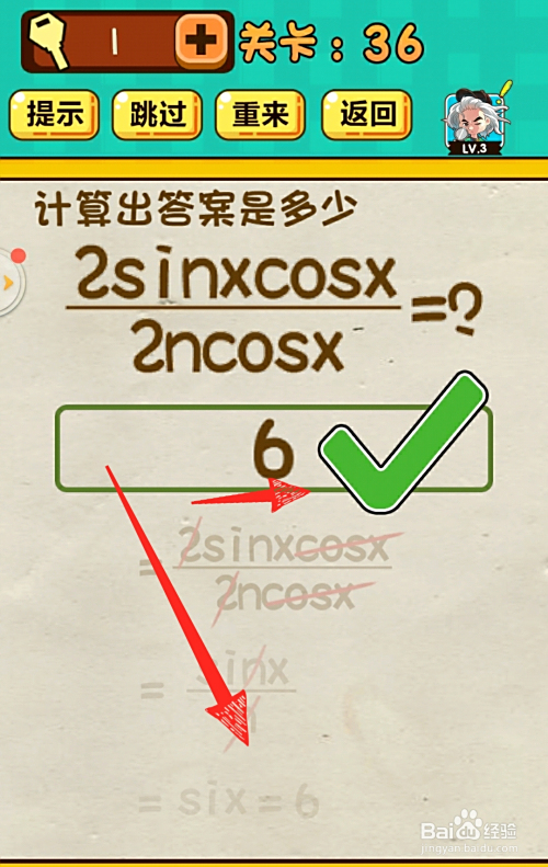 5.最后成果如下图,点击绿色键盘,输入谜底6点击确定,呈现绿色对勾,即可过关。