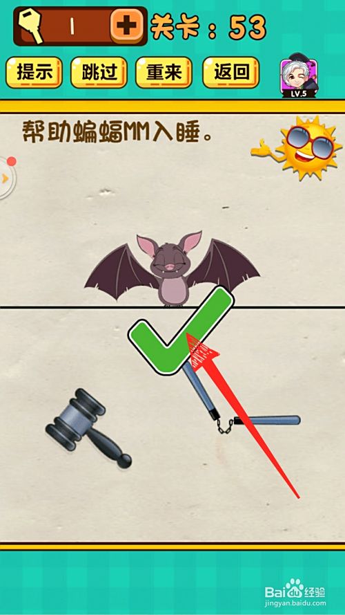 5.最后成果如下图,倒吊着的蝙蝠进入睡眠,呈现绿色对勾,即可过关。