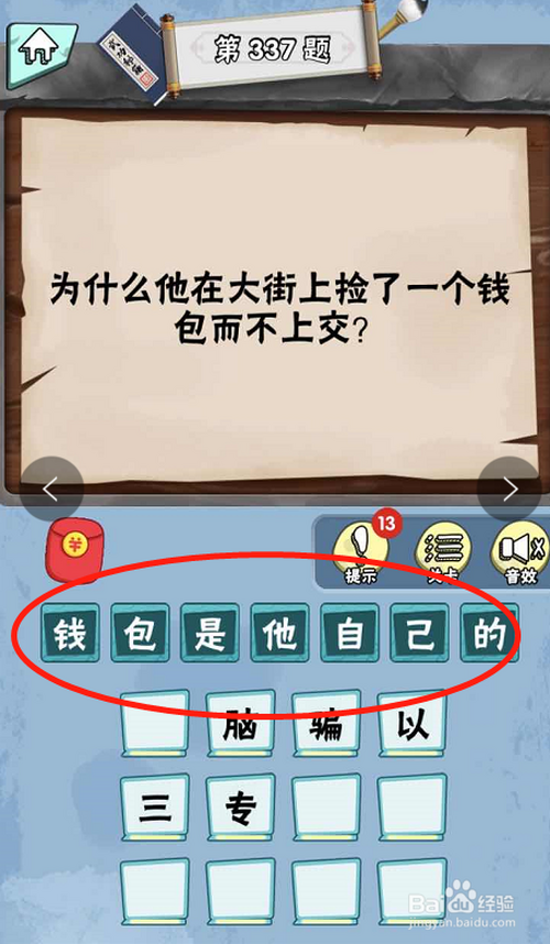 脑子急转弯达人游戏Lv6绝代奇才第337关内,提问为什么他在大街上捡了一个钱包而不上交。