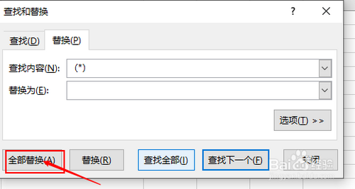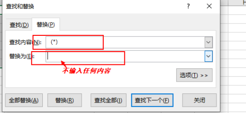 输入查找内容为(*),此中*代表所有内容,即查找所有括号包罗括号包含的内容。替代输入框中不输入任何内容
