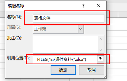 在弹出的新建名称对话框中,我们设置名称为表格文件(可自界说设置,记住名字,后续需要引用),引用位置为之前复制的文档存储路径,输入如图所示公式