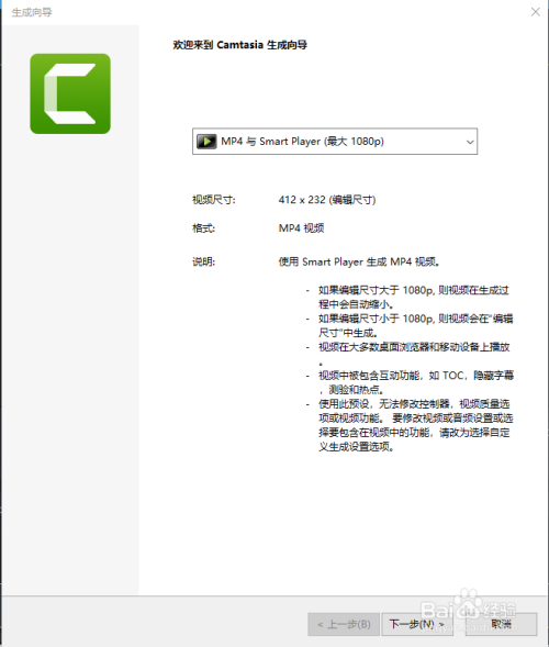 在生当作标的目的导里选择输出视频的格局,一般选择MP4(1080P)。选择下一步。