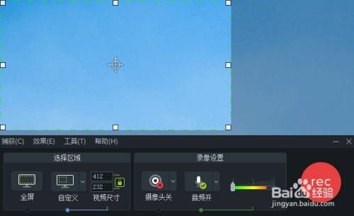 在左下角 选择区域里选择需要录制的巨细尺寸,里面有全屏和自界说。或者直接可以调整上方绿色小框的巨细。选择好尺寸后点击 红色rec起头录制。