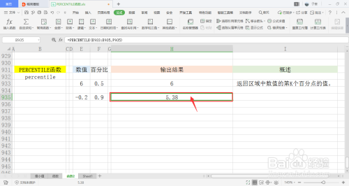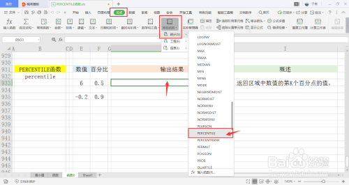 选中一个单位格用于存放输出成果,在菜单栏的公式下,打开其他函数中的统计下拉框,点击此中的PERCENTILE函数。