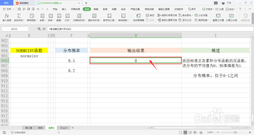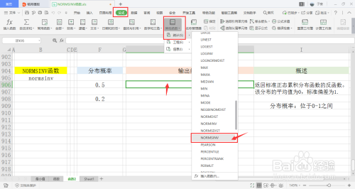 选中一个单位格用于存放输出成果,在菜单栏的公式下,打开其他函数中的统计下拉框,点击此中的NORMSINV函数。
