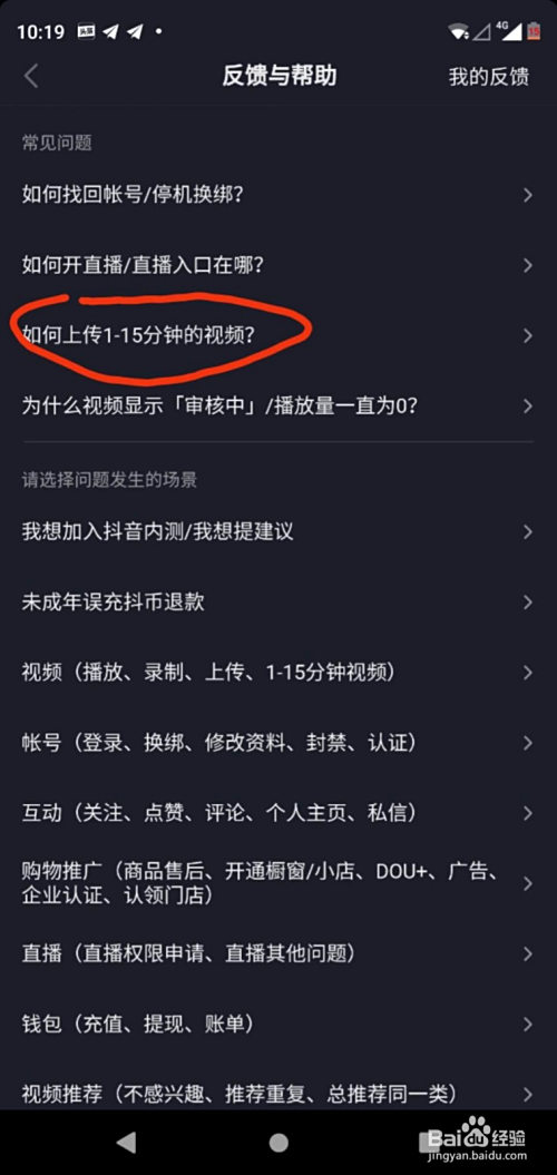 打开‘反馈与帮忙’,点击‘若何上传1-15分钟的视频?’