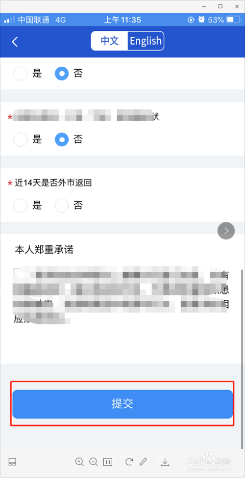 5.填写好各项信息,确保准确无误后,点击”提交“按钮提交信息,提交完毕后,即可申请和利用安康码