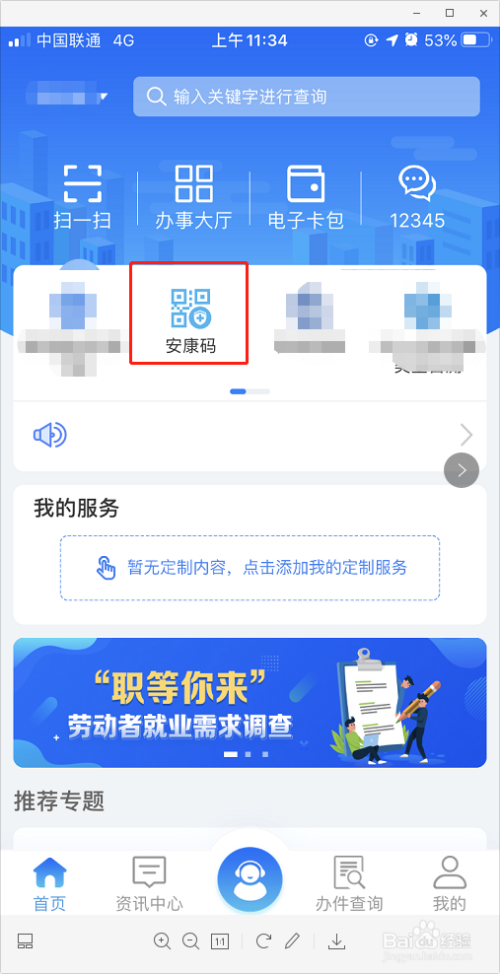 安康码若何申请以及利用,起首,下载安装皖事通APP,注册登录皖事通小我账户,进入本家儿页。