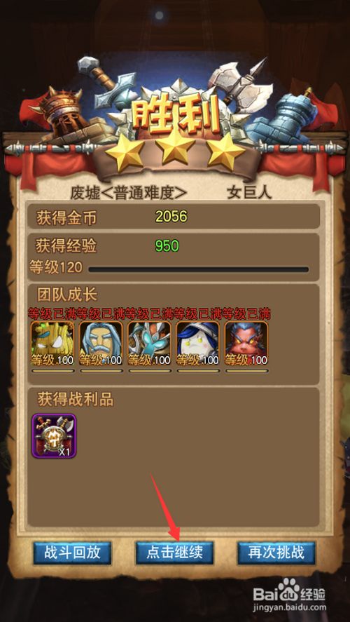 本关卡奖励950点经验,点击下方点击继续按钮分开副本。