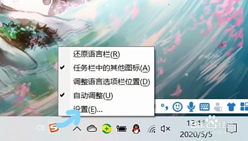 在电脑上右下角找到输入法图标(圈着的处所),然后用击鼠标右键点击它,会呈现“设置”这个选项,然后用鼠标左键点击它。