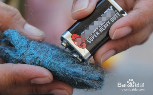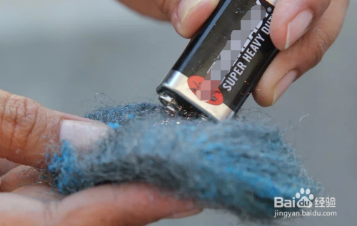 继续用钢丝绒摩擦电池。这个过程会在钢丝中发生细小的电流,然后就会产热而且燃烧了。
