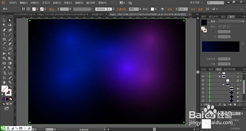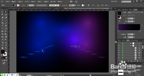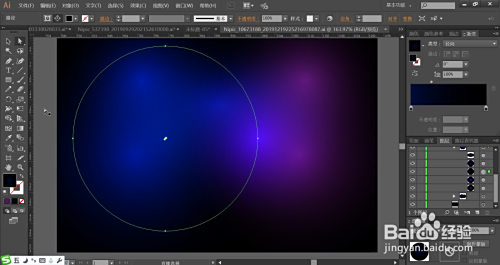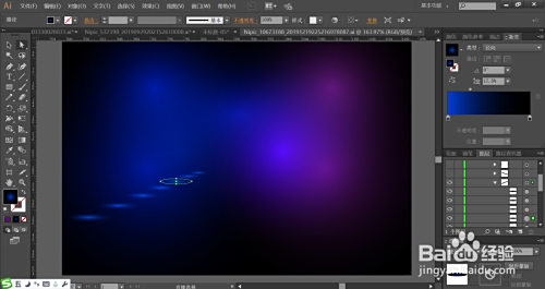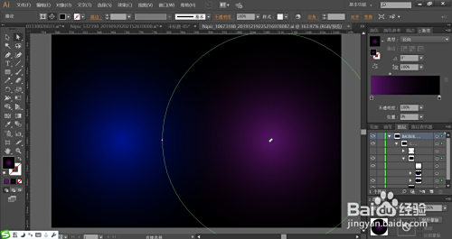 利用深蓝色的渐变填充左侧的大光圈,再用紫红色的渐变填充右侧的大光圈。设置光圈的色彩模式为滤色,让其在黑色布景上呈现出来。