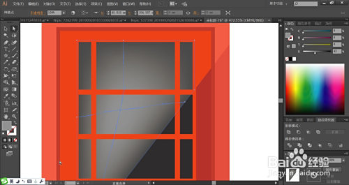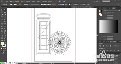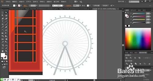 继续利用网格东西点击一下玻璃门的亮光路径让其呈现渐变色,利用浅灰色填充德律风亭后方远处的摩天轮的边缘与内部的线条。