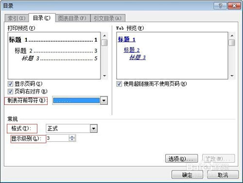 之后在‘目次’里点击‘插入目次’便会跳出一个对话框,可以自由调节制表符前导符、格局和显示级别,或者连结默认不消调节也行。