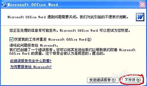 若是打开WORD时,系统弹出“错误陈述”时,点击“不发送”