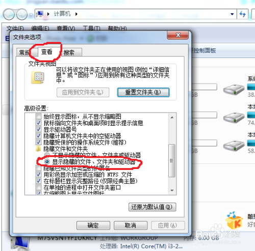 在【查看】对话框中,找到”显示埋没的文件、文件夹和驱动器“将它点选上。然后点击”确定“