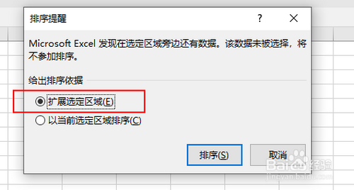 在弹出的排序提醒对话框中,选中扩展选定区域,然后点击排序
