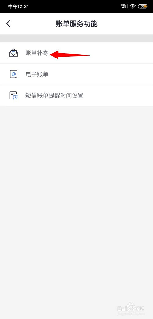 点击后,在【账单办事功能】页面点击【账单补寄】;